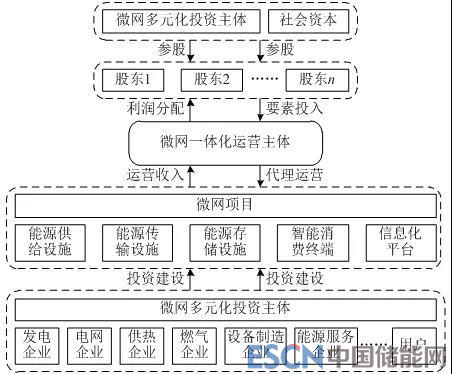 目前我國已投資建設(shè)大量微網(wǎng)項(xiàng)目,其中大部分微網(wǎng)“源-網(wǎng)-荷-儲”各環(huán)節(jié)能源設(shè)施由單一主體投資建設(shè)運(yùn)營。但是分布式能源、傳輸網(wǎng)絡(luò)、儲能等能源設(shè)施投資規(guī)模大,缺乏合理投資回報模式,微網(wǎng)項(xiàng)目主體將承擔(dān)較大投資風(fēng)險。因此,本文提出微網(wǎng)運(yùn)營一體化和投資多元化的模式框架。