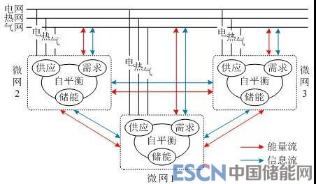 能源系統(tǒng)演化發(fā)展的基本單元是多能“供-需-儲”自平衡體,對應(yīng)園區(qū)微網(wǎng)[12],如圖2所示。微網(wǎng)通過股權(quán)并購打破能源各自運(yùn)營管控壁壘,利用互聯(lián)網(wǎng)和信息技術(shù)拉近能源生產(chǎn)和消費(fèi)距離,形成園區(qū)內(nèi)多能“供-需-儲”自平衡體。廣域范圍內(nèi)自平衡體在信息和經(jīng)濟(jì)激勵引導(dǎo)下,自主決策擴(kuò)展,與其他能源主體或自平衡體實(shí)現(xiàn)物理網(wǎng)絡(luò)互聯(lián),形成新互聯(lián)網(wǎng)絡(luò)、新自平衡體的過程,是能源系統(tǒng)演化發(fā)展的過程。能源系統(tǒng)演化發(fā)展是基于物理-信息-經(jīng)濟(jì)耦合的多個自平衡體交互,自適應(yīng)分散決策的結(jié)果。單個自平衡體與整個能源系統(tǒng)是個體與環(huán)境的關(guān)系,個體適應(yīng)環(huán)境也造就環(huán)境。園區(qū)微網(wǎng)是能源系統(tǒng)演化發(fā)展的起點(diǎn)和落腳點(diǎn)。