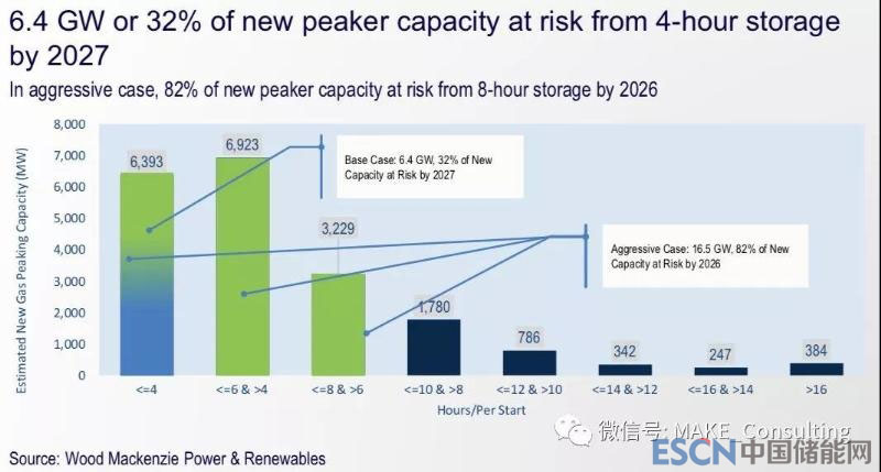 這也是Manghani的第三個預測。據(jù)Wood Mackenzie電力與可再生能源事業(yè)部預測數(shù)據(jù),至2026年,調峰電廠發(fā)電量6.4GW(約占美國所需調峰電力需求量的32%)或將被4小時或續(xù)航時間更長的儲能項目所替代。這是基于儲能成本每年度下降6-8%條件的保守預測。