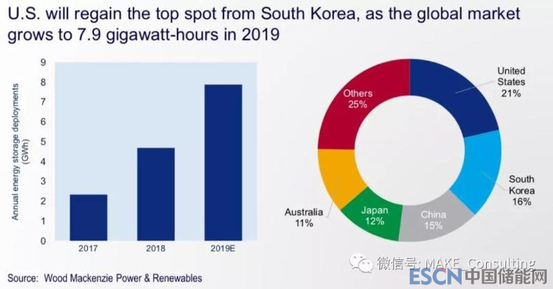但隨著FERC 841號令的啟動,戶用光儲系統(tǒng)的強勁增長及各州儲能激勵政策及發(fā)展目標的的提升與落實,美國或將于2019年重返全球第一的儲能市場地位,預計2019年新增安裝容量占全球市場約21%,韓國、中國、日本、澳大利亞各居其后。