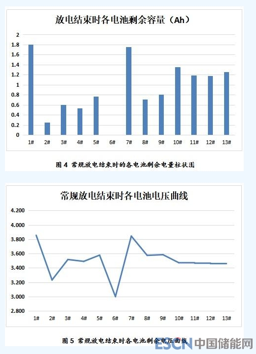當(dāng)停止放電時(shí),所有電池的電壓已開始正常反彈,但2#和6#電池的電壓反彈速度遠(yuǎn)遠(yuǎn)超過其它電池,很快就上升到3.9V左右,進(jìn)一步證實(shí)了2#和6#電池衰減非常嚴(yán)重。