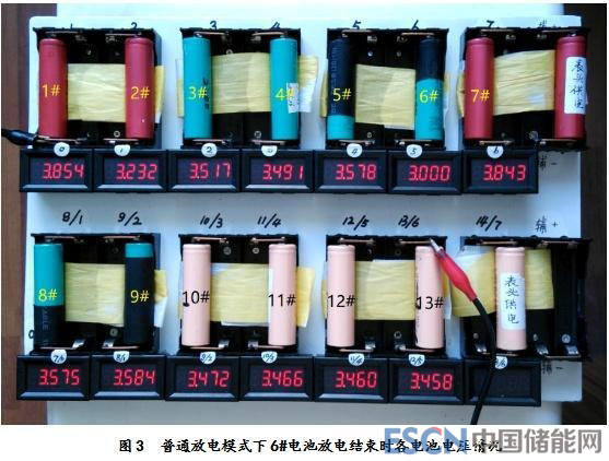 而在均衡放電實(shí)驗(yàn)中,臨近放電結(jié)束前,電壓一直處于相對最低的卻是11#電池,而不是6#電池,同樣也不是2#電池,主要原因就是均衡器的介入自動(dòng)改變了每塊電池的實(shí)際放電電流,明顯降低了2#和6#電池的實(shí)際放電電流,在常規(guī)放電實(shí)驗(yàn)中,1#和7#電池的電壓一直處于最高狀態(tài),直至放電結(jié)束,顯示出這兩塊電池的容量最大。