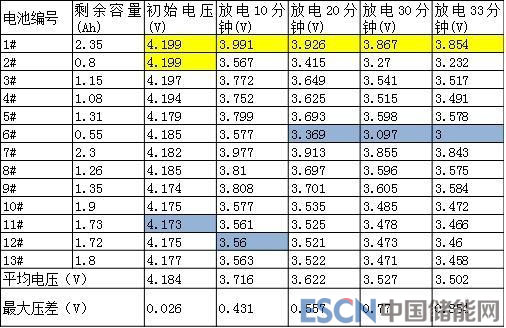 從放電測量數(shù)據(jù)可以看出,放電至33分鐘時(shí),6#電池到達(dá)放電截止電壓,停止放電,此時(shí),2#電池的電量也即將放完,但其他11塊電池仍具有較多的電量沒有釋放出來,放電結(jié)束時(shí)的電壓就說明了一切,特別是1#和7#電池還剩余非常多的電量沒有釋放,無法利用,這種情況特別像安裝了具有單體電池放電保護(hù)的BMS電池管理系統(tǒng)的動(dòng)力電池組。