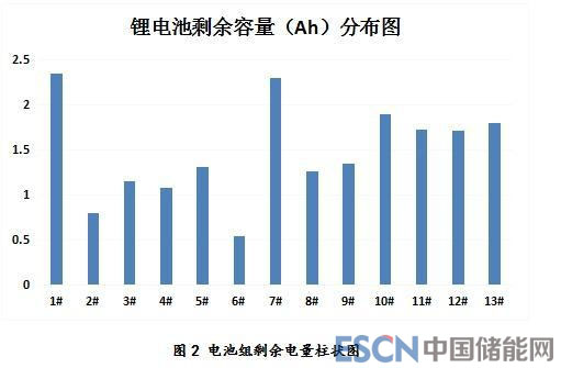 在充滿電后靜止2小時(shí)進(jìn)行容量檢測的情況下,1A放電檢測實(shí)際剩余容量只有550mAh至2350mAh之間,見表1剩余容量欄,通過檢測容量可以看出,容量差異非常大,最大差值達(dá)1.8Ah,實(shí)驗(yàn)電池共計(jì)13塊,所有電池剩余電量柱狀圖如圖2 所示。