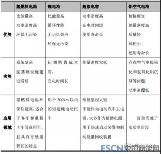 目前在交通運(yùn)輸用動力源方面,主要有四種技術(shù)路線:鋰離子電池、氫燃料電池、超級電容和鋁空氣電池。其中鋰離子電池、超級電容和氫燃料電池得到廣泛的應(yīng)用,而鋁空氣電池尚處于實(shí)驗(yàn)室研究階段。能源補(bǔ)給方面,鋰離子電池、超級電容適用于純電動汽車,但是需要外部充電,而氫燃料電池汽車則需要外部氫氣加注,鋁空氣電池則需要補(bǔ)充鋁板和電解液。