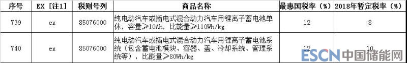 高工鋰電查閱《進口商品最惠國暫定稅率表》發(fā)現(xiàn),純電動汽車或插電式混合動力汽車用鋰離子蓄電池單體的2018年暫定稅率為8%,最惠國稅率為12%;純電動汽車或插電式混合動力汽車用鋰離子蓄電池系統(tǒng)的暫定稅率為10%,最惠國稅率為12%。