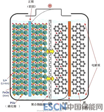 左邊是橄欖石結(jié)構(gòu)的LiFePO4作為電池的正極,由鋁箔與電池正極端子連接,右邊是由碳(石墨)組成的電池負(fù)極,由銅箔與電池的負(fù)極端子連接,中間是隔膜,它把正極與負(fù)極隔開,但鋰離子Li+可以通過而電子e-不能通過,電池的上下端之間是電池的電解質(zhì),為鋰離子運動提供運輸介質(zhì)。