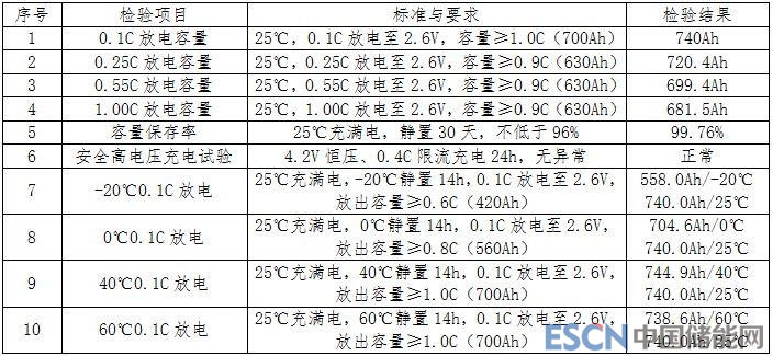 表2 (700Ah)磷酸鐵鋰電池檢驗報告