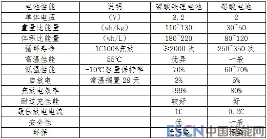 表3 磷酸鐵鋰電池和鉛酸電池性能比較
