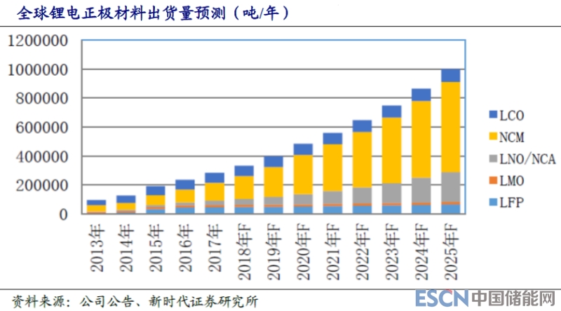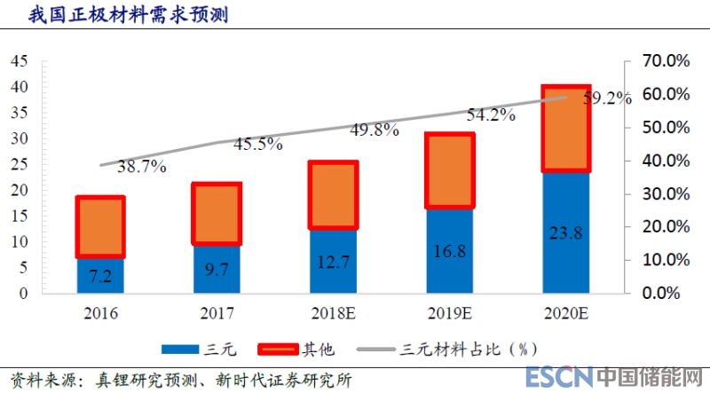 中國儲能網訊:2018~2020年我國正極材料需求量分別有望達到25.5、31和40.2萬噸,其中2018~2020年三元正極需求量分別為12.7、16.8和23.8萬噸。