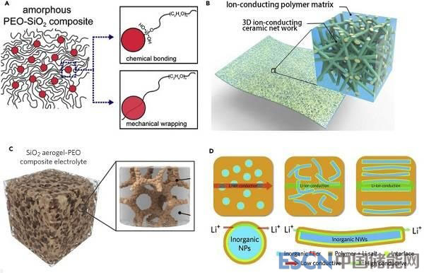 CSEs根據(jù)主要成分分為兩類:聚合物基質(zhì)(CPEs)和無機(jī)材料基質(zhì)。具有無機(jī)填料的SPEs的CPEs,通常顯示出更高的離子電導(dǎo)率、更好的機(jī)械性能和與電極的相容性。構(gòu)建可結(jié)合有機(jī)和無機(jī)電解質(zhì)優(yōu)點(diǎn)的CPEs被認(rèn)為是制造高性能的柔性電池的非常有前景的方法,同時(shí)增強(qiáng)機(jī)械性能有助于防止鋰枝晶生長以提高安全性。