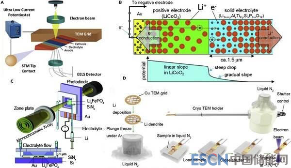 (B)通過TEM操作的EH,在充電狀態(tài)(頂部)下的電極—電解質(zhì)界面處的鋰離子和電子的分布以及測量的電位分布(底部);