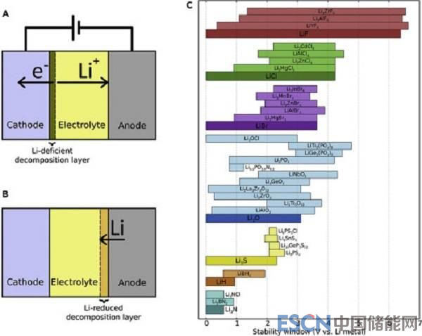 圖四、SSEs電極—電解質(zhì)界面示意圖及電化學(xué)穩(wěn)定性區(qū)域