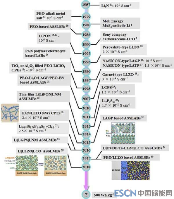 圖一、典型固體電解質(zhì)(SSE)和固態(tài)電池(ASSLBs)向ASSLMBs發(fā)展的簡要年表