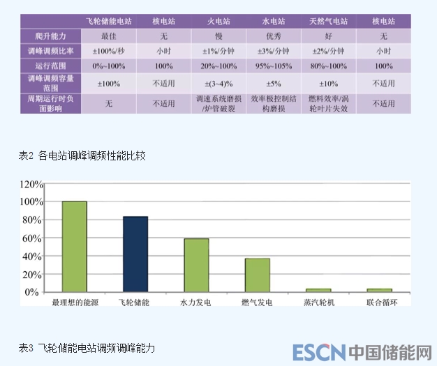 在電網(wǎng)的調(diào)頻調(diào)峰方面,飛輪儲能電站與核電站,火電站等其他類型的電站相比,在爬升能力,調(diào)峰調(diào)頻比率等方面有著一定的優(yōu)勢,如表2所示。表3顯示了飛輪儲能電站的調(diào)頻調(diào)峰能力,1MW飛輪儲能提供的調(diào)峰能力相當于2-24MW其它傳統(tǒng)發(fā)電系統(tǒng)的調(diào)峰容量,30-50MW儲能調(diào)峰優(yōu)于100MW的燃氣輪機的調(diào)峰能力。