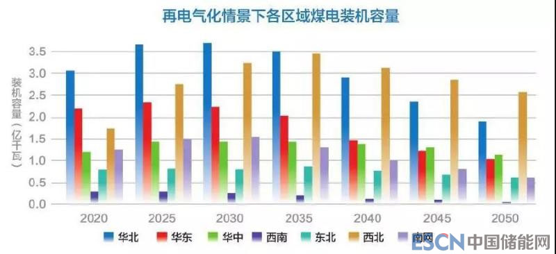 從在電源結(jié)構(gòu)中的份額來看,未來我國煤電裝機容量占比呈持續(xù)下降趨勢,2050年全國煤電裝機占比下降至15%左右。除西南地區(qū)電源結(jié)構(gòu)特殊外,其余地區(qū)煤電裝機普遍下降至當?shù)仉娫唇Y(jié)構(gòu)的約10%~20%區(qū)間。