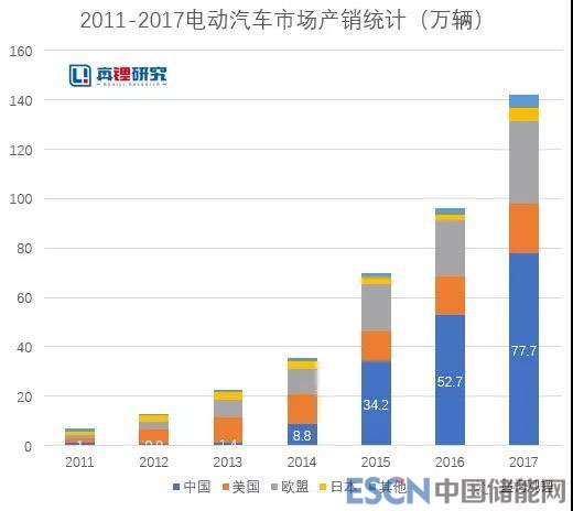移動(dòng)通信終端智能化的普及以及鋰離子電池技術(shù)的發(fā)展為汽車智能化提供了沃土,電動(dòng)汽車應(yīng)運(yùn)而生。2010年12月,通用和日產(chǎn)先后在美國市場推出電動(dòng)汽車產(chǎn)品VOLT和LEAF,開啟了智能化的第二階段進(jìn)程。在2011年這個(gè)電動(dòng)汽車商業(yè)化元年,全球共產(chǎn)銷電動(dòng)汽車6.8萬輛,對(duì)應(yīng)的鋰離子電池需求176.7萬kWh。2017年,全球共產(chǎn)銷電動(dòng)汽車140萬輛,7年間年均復(fù)合增長率高達(dá)54%;對(duì)應(yīng)的鋰離子電池需求5370萬kWh,年均復(fù)合增長率高達(dá)63%。汽車電動(dòng)化時(shí)代已經(jīng)到來。電動(dòng)汽車的大發(fā)展也直接帶動(dòng)了鋰離子電池在電動(dòng)自行車、電動(dòng)三輪車、低速電動(dòng)汽車等其他交通工具上的應(yīng)用,2017年整個(gè)交通工具市場的鋰電需求為6667萬kWh,已超越消費(fèi)類電子產(chǎn)品市場而成為鋰離子電池最大的應(yīng)用市場。
