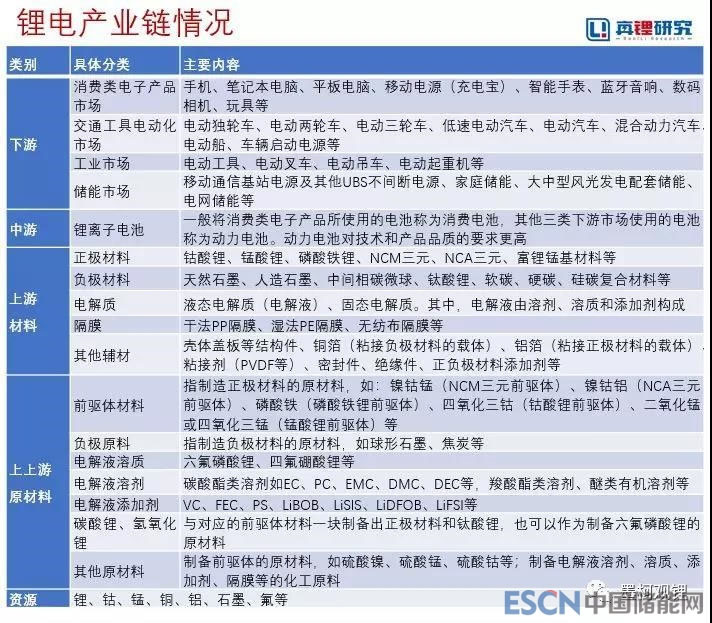 鋰電市場的大發(fā)展直接帶動(dòng)了制造鋰離子電池所需的材料(包括正極材料、負(fù)極材料、電解液、隔膜四大關(guān)鍵材料及其他輔材)、制造相關(guān)材料所需的原材料等產(chǎn)業(yè)的大發(fā)展,也快速提升了這些材料和原材料制造所需的資源的需求。表2是鋰電產(chǎn)業(yè)鏈的情況描述,這些材料端和資源端的具體產(chǎn)業(yè)發(fā)展情況,這里就不贅述。