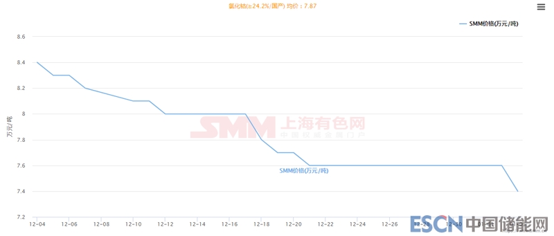 金屬鋰前期價格下跌2萬元/噸,SMM金屬鋰價格為79-82萬元/噸(低幅工業(yè)級,高幅電池級)。SMM認(rèn)為,下跌的關(guān)鍵原因是下游需求減少。據(jù)下游廠家表示,沿海地區(qū)由于環(huán)保檢查,許多生產(chǎn)醫(yī)藥中間體的企業(yè)不得不減產(chǎn)停產(chǎn)進(jìn)行技改。預(yù)計春節(jié)后,第一季度末才會恢復(fù)正常生產(chǎn)。