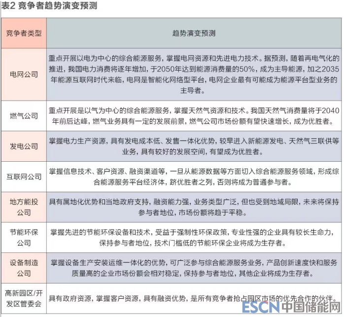 投資公司和各類(lèi)供應(yīng)商在整個(gè)能源產(chǎn)業(yè)鏈條上各司其職,彼此不構(gòu)成競(jìng)爭(zhēng)關(guān)系。但隨著綜合能源服務(wù)的快速發(fā)展,各類(lèi)主體都依托主業(yè)優(yōu)勢(shì)向客戶(hù)側(cè)業(yè)務(wù)延伸,搶占市場(chǎng)份額與客戶(hù)資源,未來(lái)彼此將成為競(jìng)爭(zhēng)者。