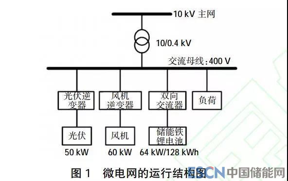 在微電網(wǎng)運(yùn)行的過(guò)程中必須要保障運(yùn)行的穩(wěn)定性和可靠性,在獨(dú)立運(yùn)行的過(guò)程中一般不會(huì)考慮微電網(wǎng)的經(jīng)濟(jì)性,只有在微電網(wǎng)接入配電網(wǎng)之后,才需要計(jì)算微電網(wǎng)的經(jīng)濟(jì)性。以陜西某區(qū)域的微電網(wǎng)并入配電網(wǎng)的過(guò)程為研究對(duì)象,該微電網(wǎng)的運(yùn)行結(jié)構(gòu)如圖1所示。