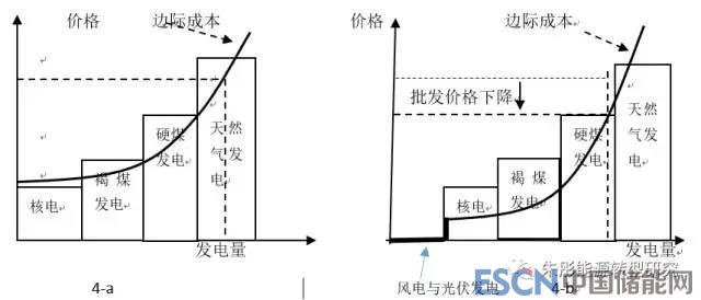 與化石燃料發(fā)電廠相比,風電和太陽能發(fā)電的特點是高投資成本、低運營成本和零燃料成本,其發(fā)電邊際成本接近于零。當可再生能源進入電力市場,由于可再生能源發(fā)電邊際成本最低(接近于零),加上法律規(guī)定電網(wǎng)優(yōu)先全額收購,因此首先是可再生能源電力進入市場,然后才是核電、煤電通過競價進入市場滿足電力需求。在這種情況下,邊際成本更高的天然氣發(fā)電,甚至部分煤電就被排除在市場之外。電力市場供應(yīng)曲線(邊際成本線)右移、結(jié)算價格下移,導(dǎo)致結(jié)算價格下跌(圖4-b)。
