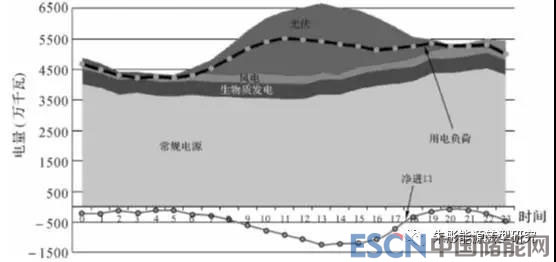 從圖3可以看出,6月9日中午光伏出力非常大,至中午13時光伏出力達到最高值,約2300萬千瓦,此時光伏出力占電網(wǎng)系統(tǒng)出力超過50%。從上午8點到下午18點,其他電源,包括常規(guī)電源(火電、核電、水電)、風電、生物質(zhì)發(fā)電的出力,并沒有發(fā)生很大波動。