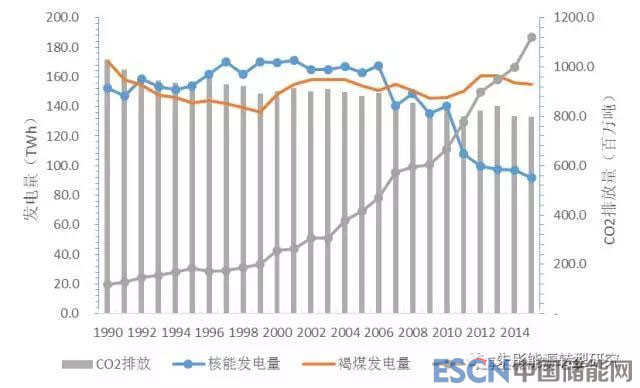 圖2 德國1990-2015年褐煤、核能與可再生能源發(fā)電量及CO2排放
