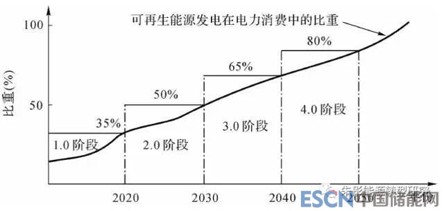 根據(jù)德國制定的可再生能源發(fā)展目標(biāo)規(guī)劃,全國總發(fā)電中可再生能源發(fā)電的比重2020年達(dá)到35%,2030年達(dá)到50%,2040年達(dá)到65%,2050年達(dá)到80%以上。根據(jù)這四個(gè)發(fā)展目標(biāo),筆者把德國能源轉(zhuǎn)型分為1.0、2.0、3.0和4.0四個(gè)階段(圖1)。2015年,德國可再生能源電力在電力總消費(fèi)比重為32.6%。因此,目前德國處于能源轉(zhuǎn)型1.0階段。
