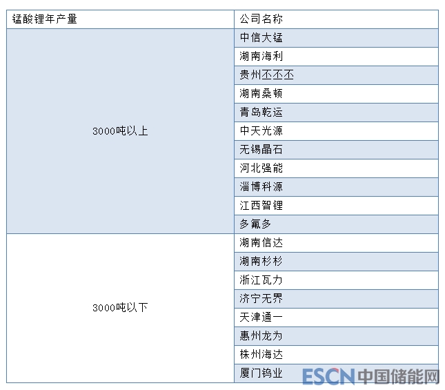 2018年受環(huán)保因素影響,作為錳酸鋰主要原料之一的二氧化錳,市場(chǎng)供應(yīng)緊張,價(jià)格堅(jiān)挺。加上下游鋰電池企業(yè)回款速度慢,錳酸鋰企業(yè)憑借產(chǎn)品性能的大大提升及價(jià)格優(yōu)勢(shì),在鋰電行業(yè)獲得了一席之地。2018年年產(chǎn)量超過(guò)3000噸的企業(yè)達(dá)到了11家,較2017年增加5家。