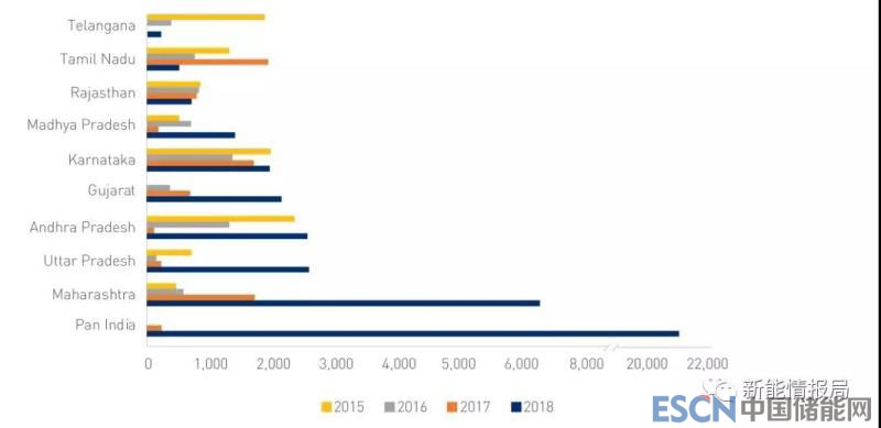 印度發(fā)布的招標主要都是由SECI主導的(約21.3GW)。招標量排前五的邦分別是Maharashtra,Uttar Pradesh,Andhra Pradesh,Gujarat以及Karnataka 邦。