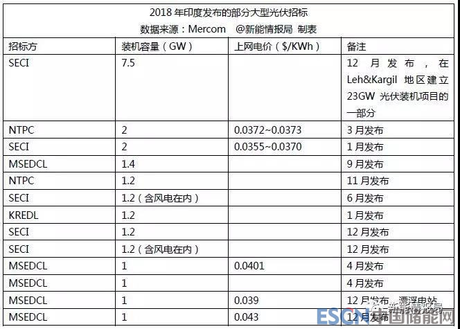 Mercom匯總的2018年印度部分大型光伏招標信息如下: