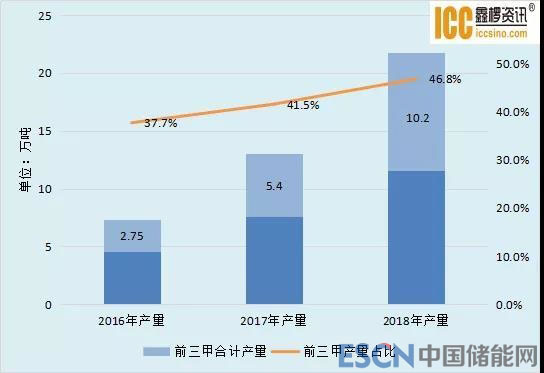 2018年三元前驅(qū)體行業(yè)集中度仍在繼續(xù)提高,前三甲企業(yè)總產(chǎn)量超過(guò)10萬(wàn)噸,占據(jù)15家其企業(yè)總產(chǎn)量的46.8%,較去年提高了5.3%。