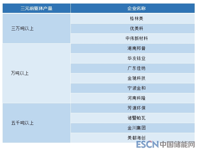 2018年,前驅(qū)體產(chǎn)量前三甲依舊是格林美、優(yōu)美科以及中偉新材料,這三家企業(yè)的前驅(qū)體年產(chǎn)量均躍至3萬(wàn)噸以上。2018年國(guó)內(nèi)共有9家三元前驅(qū)體企業(yè)的年產(chǎn)量超過(guò)了1萬(wàn)噸,較2017年增加5家。