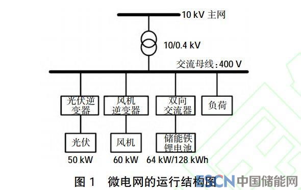 在微電網(wǎng)運(yùn)行的過程中必須要保障運(yùn)行的穩(wěn)定性和可靠性,在獨(dú)立運(yùn)行的過程中一般不會(huì)考慮微電網(wǎng)的經(jīng)濟(jì)性,只有在微電網(wǎng)接入配電網(wǎng)之后,才需要計(jì)算微電網(wǎng)的經(jīng)濟(jì)性。以陜西某區(qū)域的微電網(wǎng)并入配電網(wǎng)的過程為研究對象,該微電網(wǎng)的運(yùn)行結(jié)構(gòu)如圖1所示。