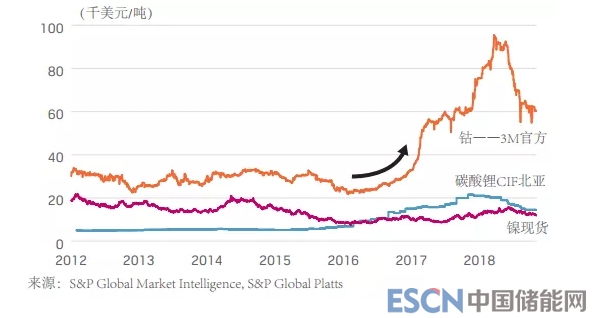 自2016年以來(lái),在倫敦金屬交易所(LME)交易的鈷價(jià)已翻了兩番多,在2018年3月達(dá)到9.55萬(wàn)美元/噸的峰值。同樣地,碳酸鋰價(jià)格自2016年以來(lái)已翻了一番多,但近期一直在下滑。自5月4日S&P Global Platts推出電池級(jí)碳酸鋰估價(jià)以來(lái),海運(yùn)市場(chǎng)價(jià)格已大幅下滑,遠(yuǎn)低于最初估報(bào)的1.8萬(wàn)美元/噸水平。