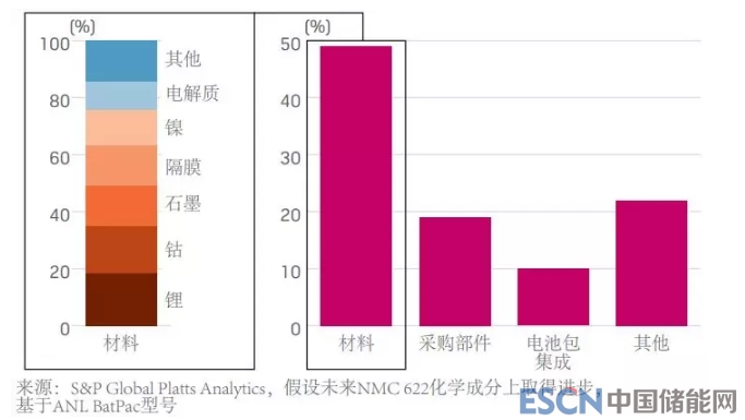 材料目前在電池總成本中占近50%,其中鈷、鋰、鎳和石墨最為昂貴,占總成本的30%。在其他方面不變的情況下,工藝和化學(xué)成分改良及電池包工程技術(shù)進(jìn)步將降低電池價(jià)格。反過(guò)來(lái),電池成本的金屬價(jià)格風(fēng)險(xiǎn)將增加,因?yàn)檫@些關(guān)鍵原材料在電池價(jià)格中占較大比重。