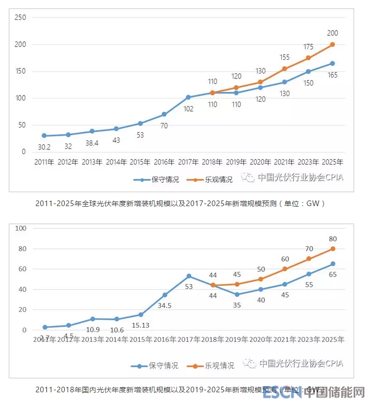2018年,全球光伏新增裝機(jī)市場(chǎng)預(yù)計(jì)達(dá)到110GW,創(chuàng)歷史新高。2019年,在光伏發(fā)電成本持續(xù)下降和新興市場(chǎng)拉動(dòng)等有利因素的推動(dòng)下,全球光伏市場(chǎng)仍將保持增長(zhǎng),預(yù)計(jì)全年全球光伏新增裝機(jī)量將超過110GW,樂觀情形下甚至達(dá)到120GW。受政策影響,2018年國(guó)內(nèi)光伏新增裝機(jī)下滑至44GW,同比下降19%,但仍居全球首位,預(yù)計(jì)2019年仍將保持35-45GW的新增市場(chǎng)需求。