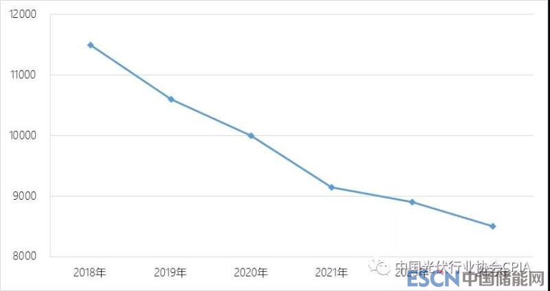 2018-2025年三氯氫硅法多晶硅生產(chǎn)線設(shè)備投資成本變化趨勢(shì)(單位:萬元/千噸)