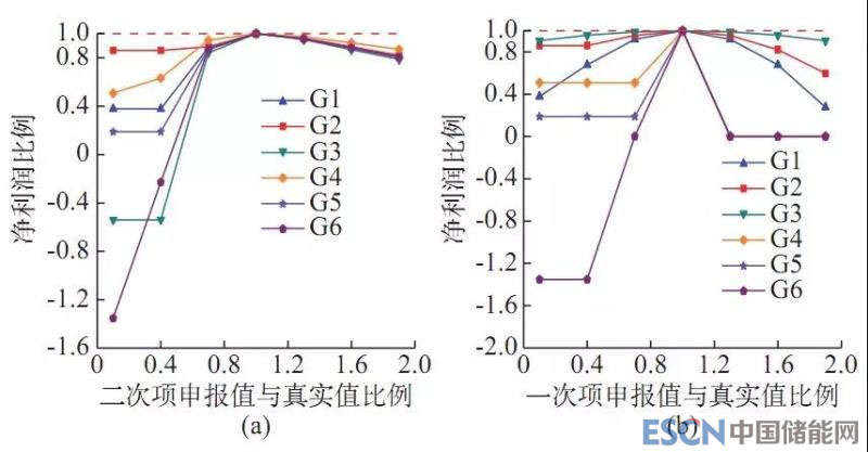 由圖4結果可知,當發(fā)電機組G1-G6真實報價時,發(fā)電機組獲得最大凈利潤,分別為47.24, 72.37, 32.74, 13.86, 7.11和7.11美元。對發(fā)電機組的一次成本和二次成本進行參數(shù)掃描,并按照最大凈利潤折算成圖 4中的百分比,可以發(fā)現(xiàn)發(fā)電機組虛報高價或惡意報低都將使凈收益降低。例如,如果G1申報高于真實二次成本的30%,則凈收益將降低4.1%;如果G1申報低于真實二次成本的30%,則凈收益將降低11.5%。