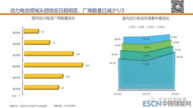 另一方面,雖然市場(chǎng)需求在不斷增加,但“看不見(jiàn)的手”已經(jīng)開(kāi)始起作用了,國(guó)內(nèi)動(dòng)力電池廠商數(shù)量較2016年峰值時(shí)減少1/3。根據(jù)中國(guó)汽車動(dòng)力產(chǎn)業(yè)聯(lián)盟的統(tǒng)計(jì),在2018年有93家企業(yè)實(shí)現(xiàn)供貨,其中供應(yīng)量超過(guò)1GWh的廠商只有7家;市場(chǎng)集中度進(jìn)一步增加,前20家企業(yè)市場(chǎng)份額接近92%,剩余73家廠商只能瓜分8%的份額。