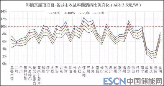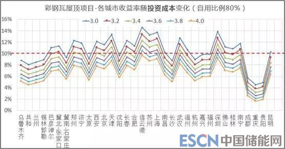 根據測算結果,對于彩鋼瓦屋面項目,初始投資成本為4.0元/W,以及消納比例在50%以下初始投資成本大于3.4元/W時,幾乎沒有城市滿足收益率要求。