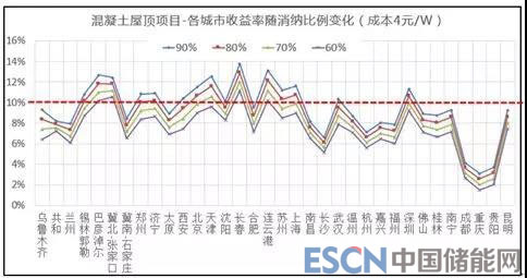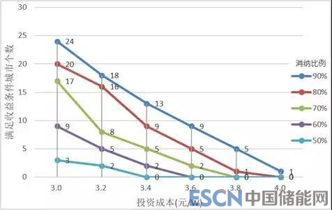 混凝土屋面項目均采用當?shù)刈罴褍A角,根據測算結果可得不同投資成本和消納比例下滿足收益要求的城市個數(shù),如下圖。當初始投資成本小于3.6元、消納比例大于70%時,有一半以上城市在無補貼條件下滿足收益率要求。