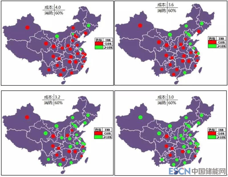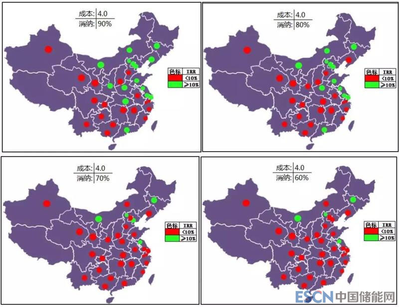 60%自用比例下有4個的城市(地區(qū))滿足收益率要求,蒙西、冀北、長春、連云港。