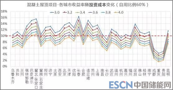 混凝土屋頂項目,自用比例取60%時,不同初始投資成本下的收益率變化: