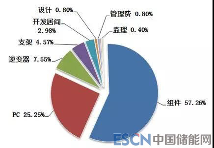 光伏電站建設成本主要包括開發(fā)費用、勘察設計費用、施工費用,以及主材設備如光伏組件、逆變器、支架等。下圖為我公司蘇南某項目復盤報告中的項目初始投資成本構成,其中光伏組件費用占比高達57%。顯然,當前光伏成本能否的大幅下降主要受制于組件成本。