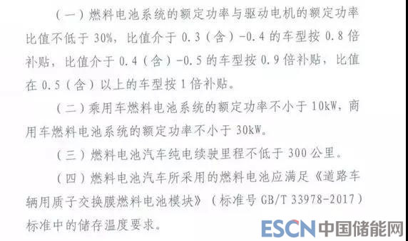 其中燃料電池乘用車按照搭載燃料電池系統(tǒng)的額定功率進(jìn)行補(bǔ)貼,補(bǔ)貼標(biāo)準(zhǔn)為6000元/KW,最高可達(dá)20萬元/輛,燃料電池輕型客車、貨車定額補(bǔ)貼30萬元/輛,燃料電池大中型客車、中重型貨車定額補(bǔ)貼50萬元/輛。納入補(bǔ)貼的燃料電池汽車要滿足以下技術(shù)要求: