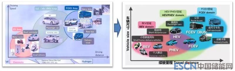 從典型新能源汽車企業(yè)的發(fā)展戰(zhàn)略來看,特斯拉公司的模式是高端切入,自上而下,以電動化為主體,逐步融合智能化和網(wǎng)聯(lián)化。其從豪華純電動跑車入門(Roadster),發(fā)展高端大型純電動轎車(Model S)和SUV(Model X),依靠強大的品牌效應(yīng)和影響力逐步下探緊湊型轎車市場,推出Model3這一標桿產(chǎn)品。從技術(shù)演進看,從電動化率先向智能化方向發(fā)展,特斯拉公司大膽推出了自動駕駛技術(shù)。該模式是新興造車企業(yè)尤其是從互聯(lián)網(wǎng)行業(yè)進入新能源汽車行業(yè)所采用的一種典型技術(shù)路線,即純電動戰(zhàn)略——電動化、智能化、網(wǎng)聯(lián)化。日本豐田公司是國際上全面開展新能源汽車技術(shù)研發(fā)的傳統(tǒng)汽車大公司之一,其混合動力和燃料電池等新能源汽車核心技術(shù)全球領(lǐng)先。豐田新能源汽車發(fā)展的技術(shù)路線核心是發(fā)動機技術(shù)優(yōu)先戰(zhàn)略——內(nèi)燃機、混合動力發(fā)動機、燃料電池發(fā)動機。該技術(shù)路線可以描述為:從先進燃油汽車、高效混合動力汽車到氫能燃料電池汽車的技術(shù)路線。具體的新能源動力系統(tǒng)研發(fā)思路是:以混合動力系統(tǒng)為基礎(chǔ)平臺,在該平臺基礎(chǔ)上分別發(fā)展插電式混合動力系統(tǒng)、純電動動力系統(tǒng)和燃料電池動力系統(tǒng)。其核心理念如圖4左所示。2018年豐田展示的新思路如圖4右所示,從中可以看出豐田技術(shù)路線的演化,即以核心部件為基礎(chǔ)平臺,混合動力和插電式混合動力、純電動、燃料電池并行發(fā)展并增加了智能網(wǎng)聯(lián)技術(shù)。在新能源汽車市場推廣與交通應(yīng)用適用性方面,豐田的思路演變?nèi)鐖D5所示。其基本思路是:純電動乘用車主要用于城市通勤,中遠距離的個人出行主要由常規(guī)混合和插電式混合動力車承擔,而對于長途重載運輸場合,燃料電池動力系統(tǒng)是卡車和公路客車的最佳選擇。圖5中右圖與左圖相比,主要變化是純電動汽車的應(yīng)用范圍大幅擴展。從兩家企業(yè)的技術(shù)路線的比較看,主觀上都是盡可能揚長避短,獲取競爭優(yōu)勢,但同時遵循技術(shù)演變與突破的客觀規(guī)律。這對我國新能源汽車技術(shù)路線的選擇提供了很好的借鑒。