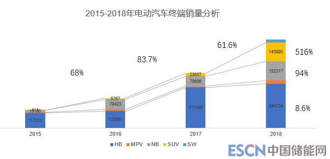 下圖是2015年到2018年,電動(dòng)汽車的終端銷量組成,向上的趨勢(shì)是一目了然的。