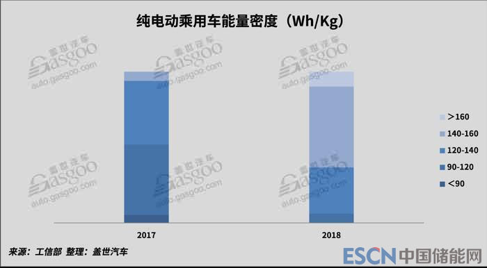 從工信部2018年發(fā)布的13批推薦目錄來看,由于新的補貼政策將能量密度的補貼門檻從2017年90Wh/kg提升至105Wh/kg,達(dá)到120Wh/kg-140Wh/kg僅能獲得1倍補貼,140Wh/kg-160Wh/kg可獲得1.1倍補貼,160Wh/kg以上可獲得1.2倍補貼,補貼促使了電池能量密度的快速增長。2018年純電動乘用車中電池能量密度在140Wh/kg以上的占比達(dá)到64%。